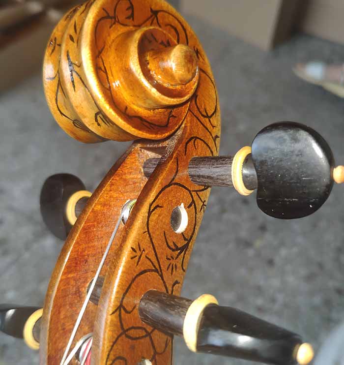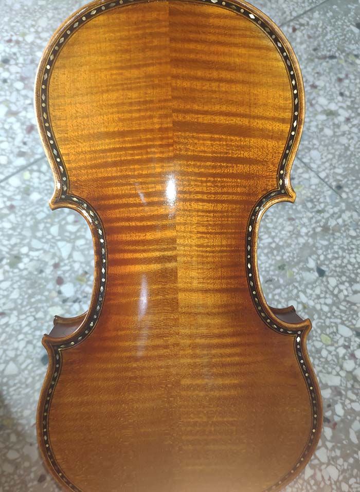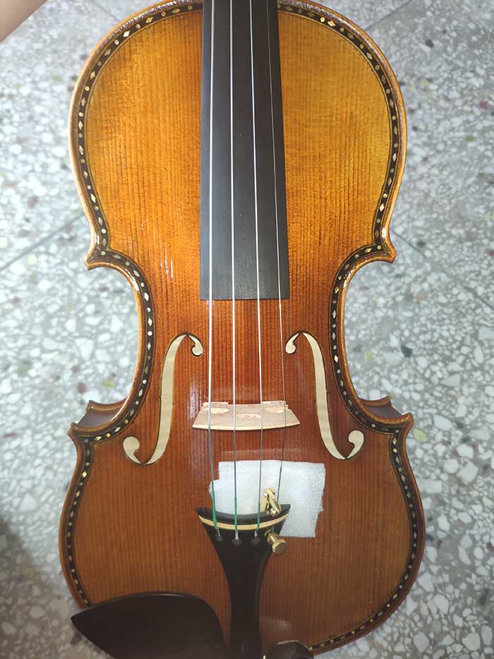 描述:一款非常精致的歐料小提琴,側板和琴頭有雕花,琴的邊緣有貝殼的鑲嵌。面板的木紋寬度在2-3毫米,背板為均勻的歐洲楓木。琴的邊緣部分油漆顏色較淺,中間部分的油漆偏深。這把琴音質非常棒,非常甜美輕盈的感覺,專業演奏者的標配。