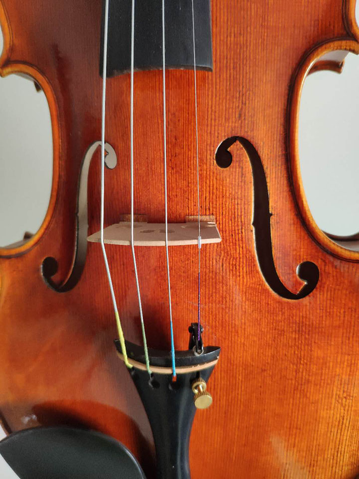 評價:這是一把非常美麗的雀眼楓背板的手工小提琴,整體顏色看上去較紅,背板上零星散落的雀眼雖然不過,但是和木材上面的深色云紋搭配起來會顯得非常美觀。面板的木質(zhì)非常均勻,木紋的平均距離都在1.5毫米左右。就琴的聲音來說,我個人感覺是聲音比較平穩(wěn),共振比較好。