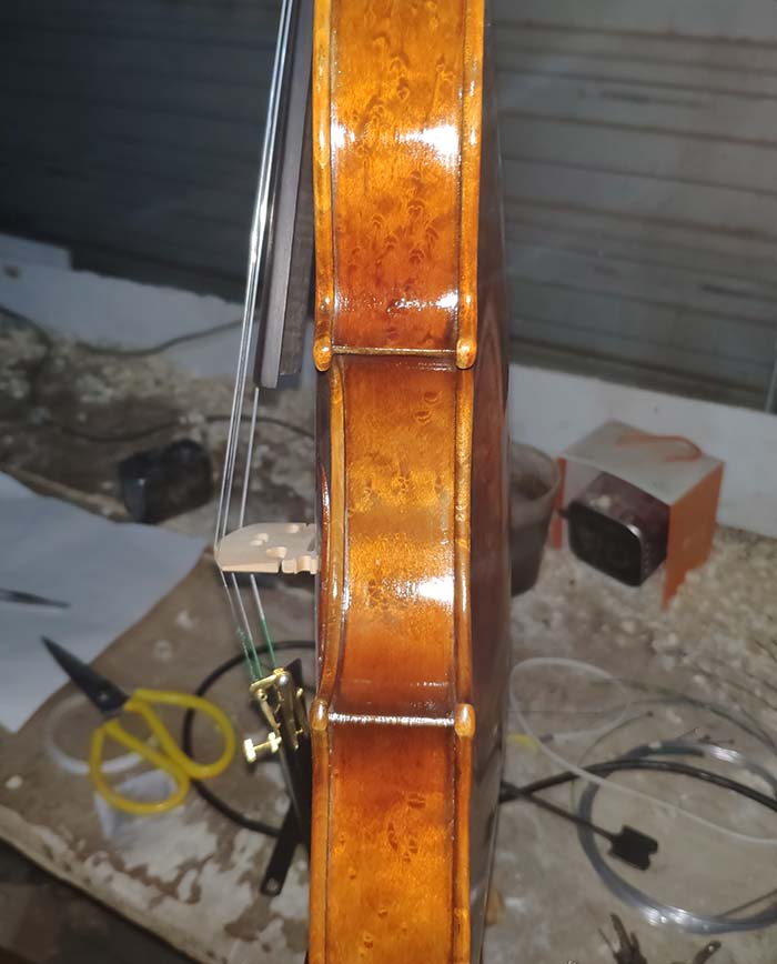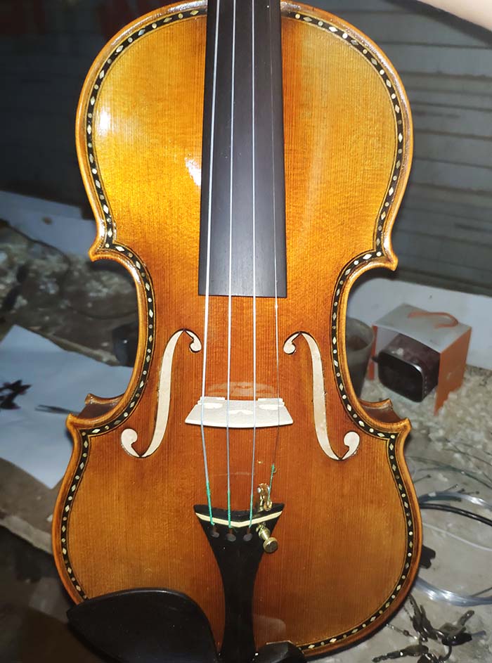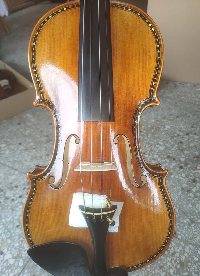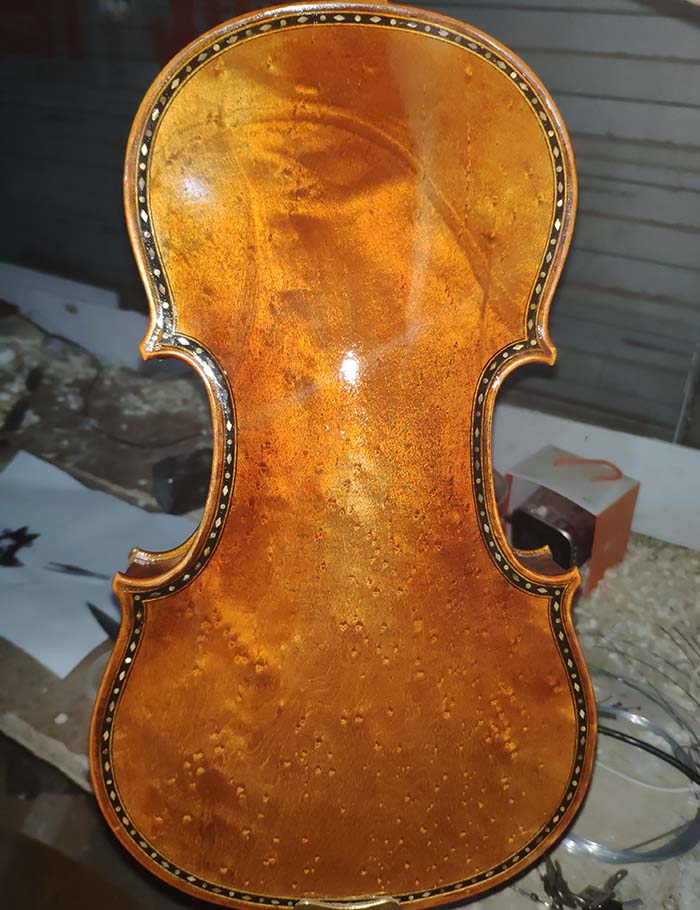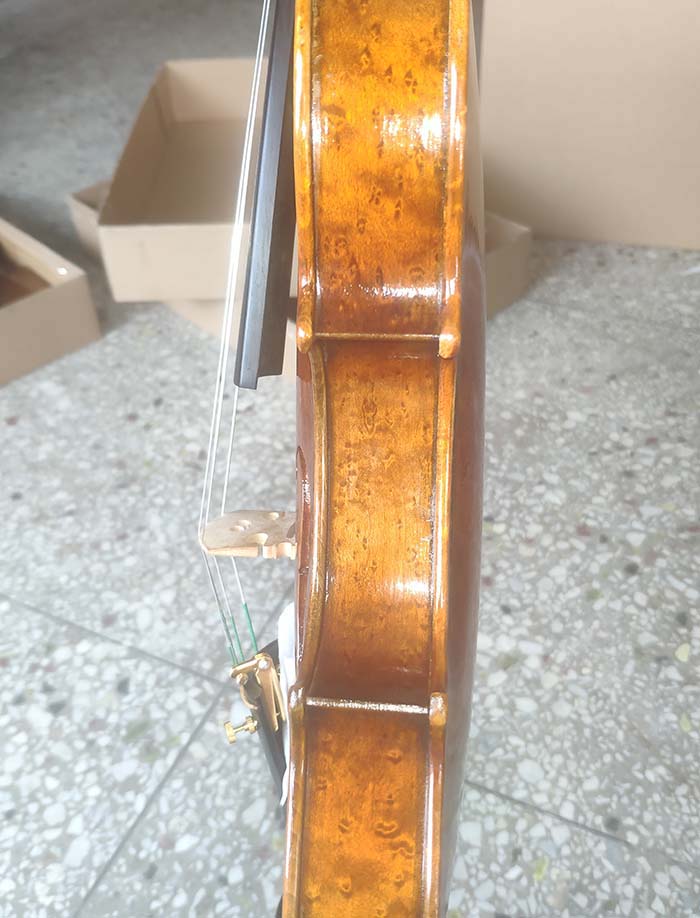 描述:一把非常漂亮的歐洲雀眼楓小提琴,面板采用的瑞士云杉木,背板采用的是歐洲雀眼楓木,雀眼非常多的那種。邊沿位置采用了貝殼鑲嵌,可以說是錦上添花、盡顯奢華。在音質方面,我只能用溫文爾雅、玩轉多變來形容,因為這把琴聲音確實非常棒。