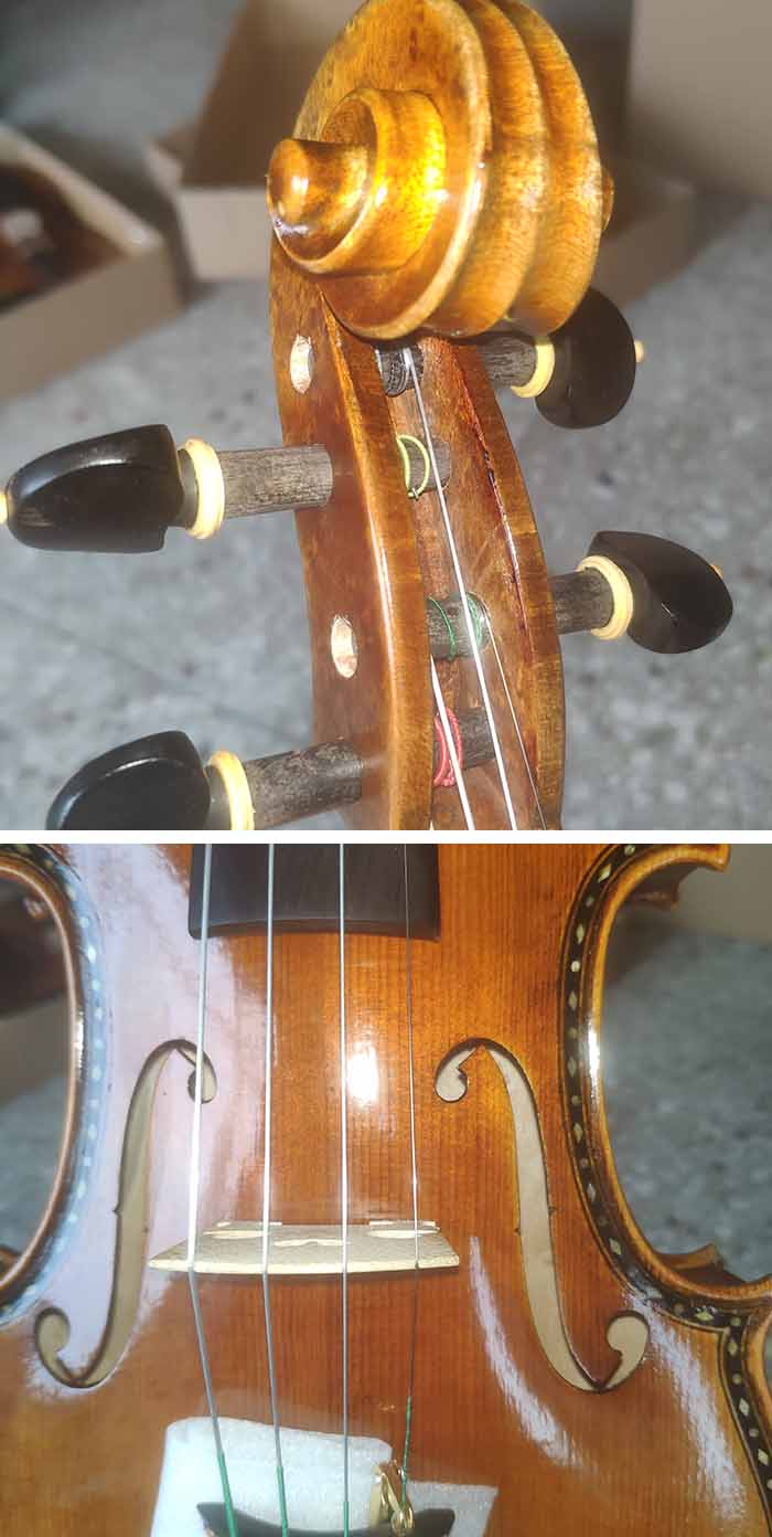 描述:一款非常精致的歐料小提琴,側板和琴頭有雕花,琴的邊緣有貝殼的鑲嵌。面板的木紋寬度在2-3毫米,背板為均勻的歐洲楓木。琴的邊緣部分油漆顏色較淺,中間部分的油漆偏深。這把琴音質非常棒,非常甜美輕盈的感覺,專業演奏者的標配。